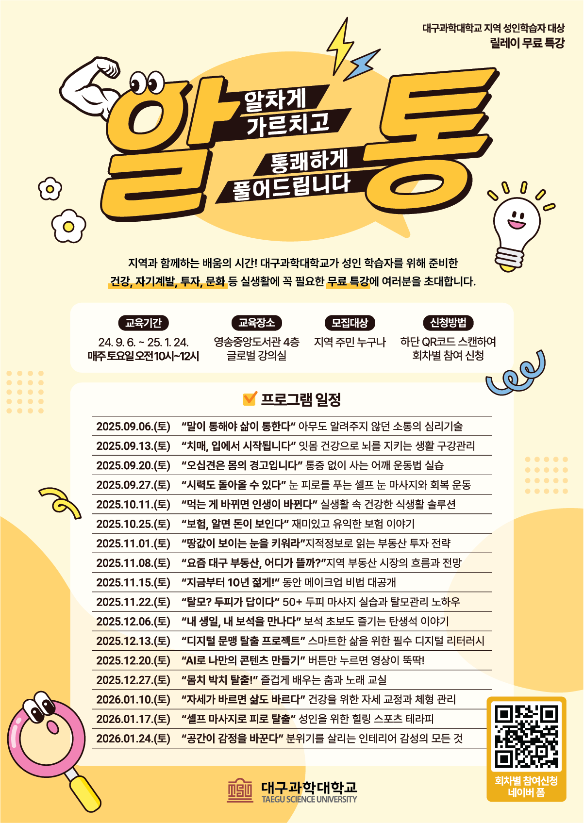 | [알통]교양중심 찾아가는 평생교육과정 대구과학대학교 지역 주민 대상 릴레이 무료 특강 |